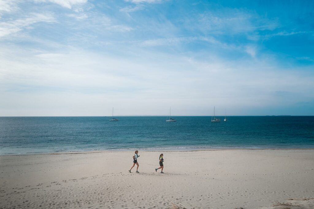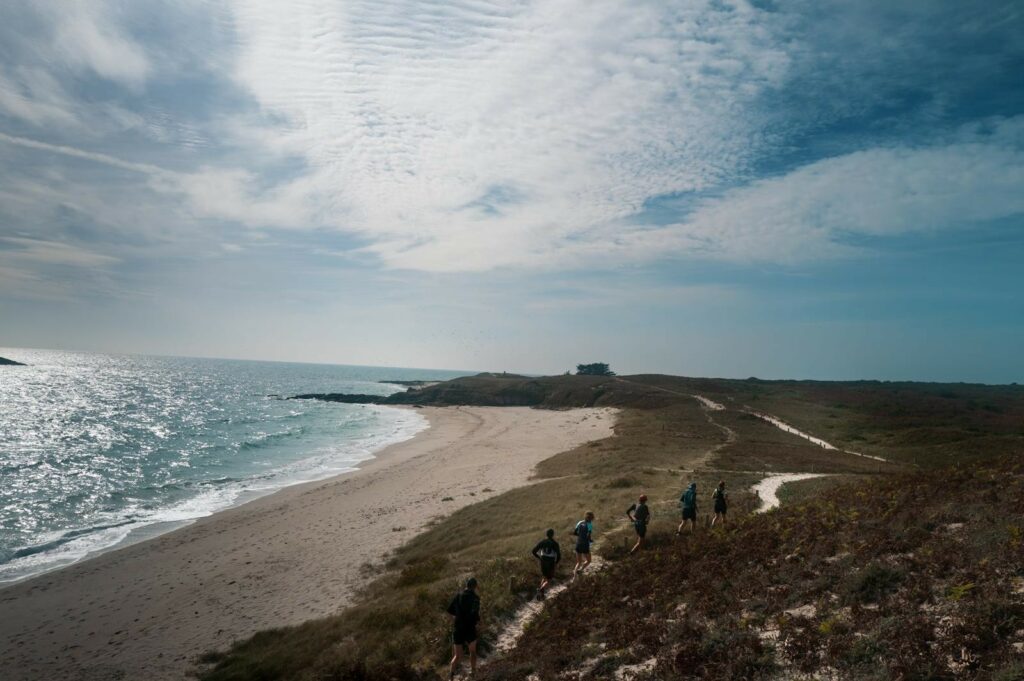 Court transfert le matin à Plouharnel. De l’isthme de Penthièvre à la pointe de Beg er Lan, ce n’est qu’une vue panoramique sur l’océan, qui est en mouvement permanent, ce qui donne une énergie folle à la course. Sentier roulant, alternant sable, petites roches et herbe.
