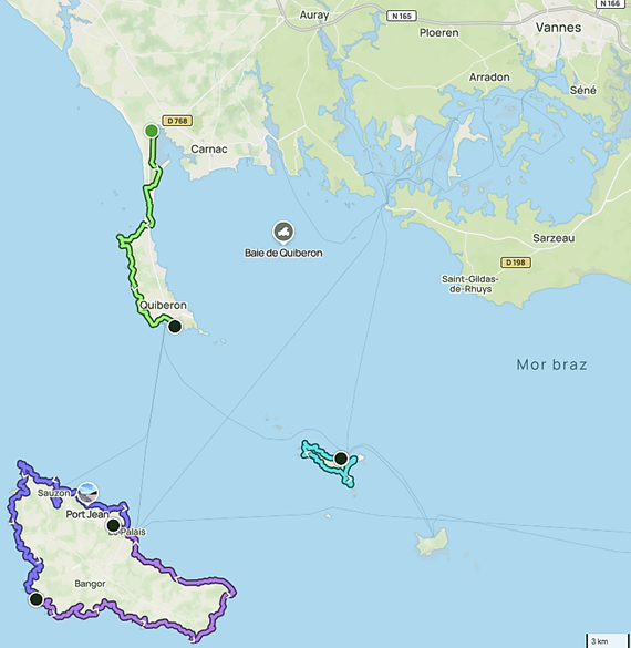 Traversée vers Houat le matin. Sensation d’espace de liberté en courant, des habitations authentiques des insulaires, une experience unique. Terrain sableux et sentier côtier très roulant avec cailloux et herbe. Traversée vers Belle-Île-en-Mer en bateau semi-rigide privatisé.