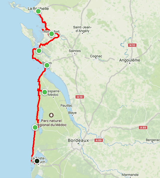 Cette étape vous plonge dans les paysages variés de la Charente-Maritime. En quittant Rochefort en direction de Tonnay-Charente, vous longerez la Charente et ses marais, traversant des villages typiques de la région. À l’approche de La Tremblade, vous découvrirez les chenaux ostréicoles et les cabanes colorées qui parsèment le paysage.