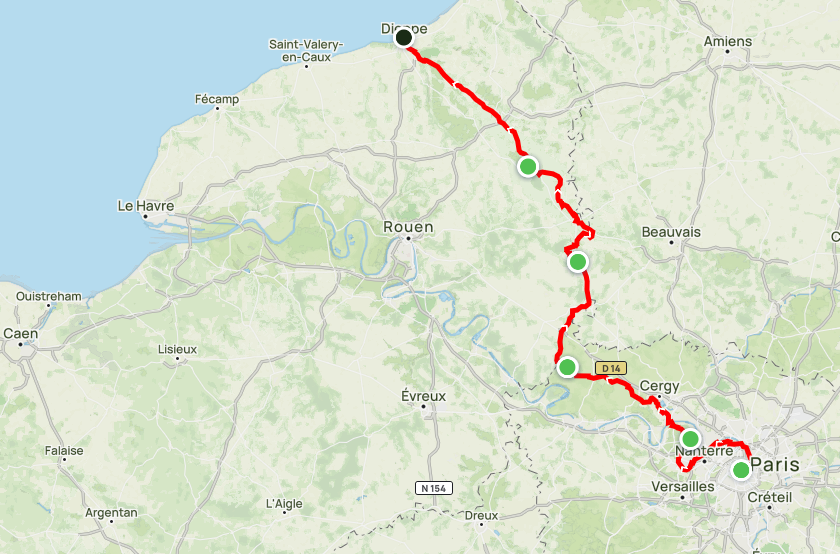 Retour au point de départ : Vers paris pour récupérer son véhicule : TER Dieppe – Paris St Lazare avec une correspondance à Rouen (environ 2h20 de trajet) https://www.sncf-connect.com/