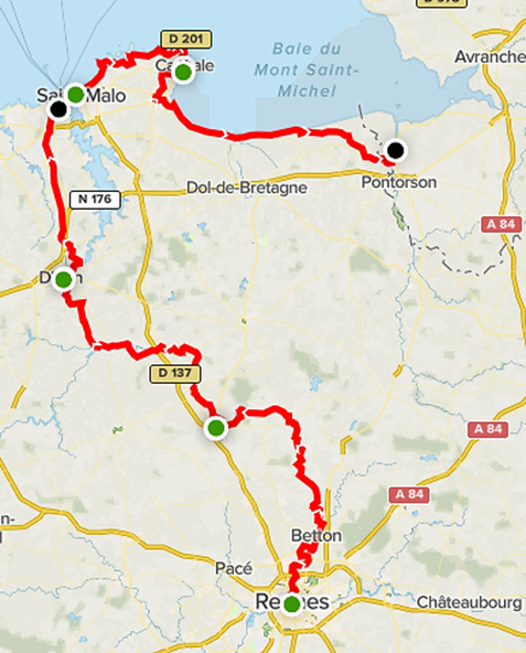Depuis la capitale de la Bretagne, vous circulez sur l’itinéraire sécurisé le long du chemin de halage pour rejoindre les cités d’art et d’histoire de Dinan puis Saint-Malo. La côte d’Emeraude avec ses belles plages de sable fin s’offre alors à vous avant de découvrir l’immense baie du Mont Saint-Michel et sa fameuse abbaye perchée sur un rocher.